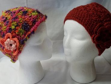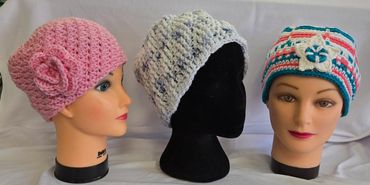 This headwear style is made with yarn in a knit or crochet pattern. Our volunteers make these in many different patterns.